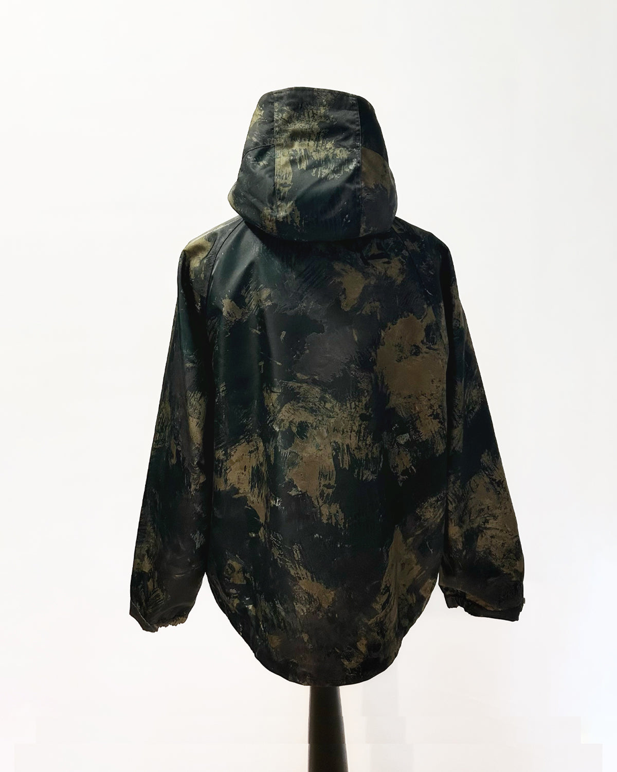 Featuring a bold abstract camouflage style pattern in earthy tones, the exterior is complemented by a luxe sheen green satin lining. Details include a signature DNA rubber patch logo on the chest, a top zip pocket with a metal ring pull, two generously constructed flap pockets at the waist for both utility and style, snap-button cuffs and a robust full-length metal zip complete the garment’s functional appeal.