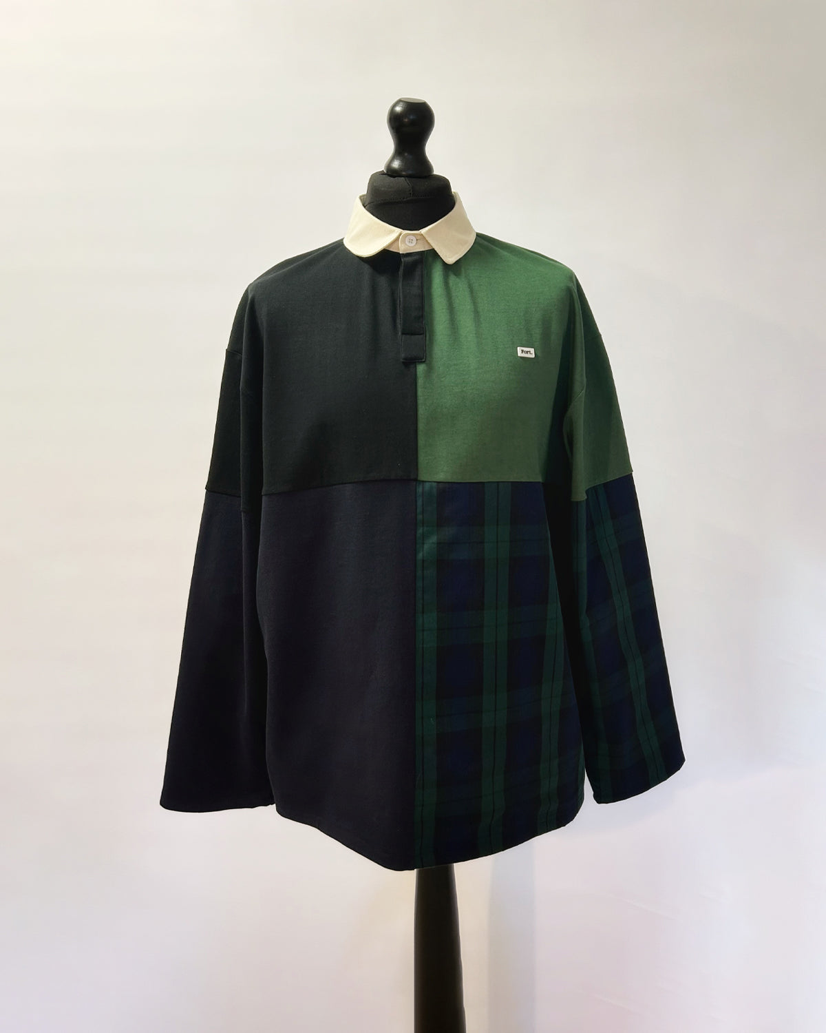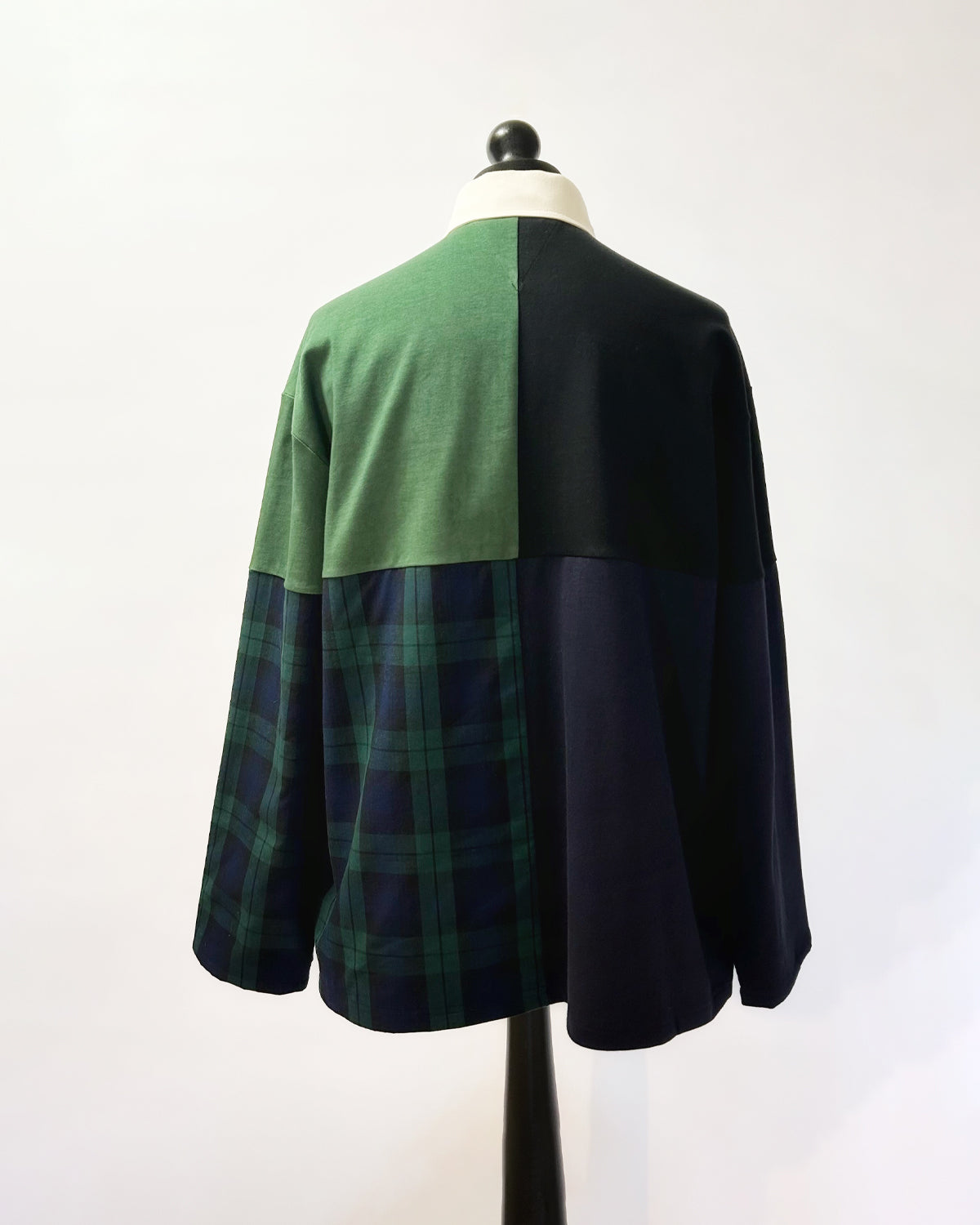 The shirt features a dynamic panel construction with contrasting colours, anchored by a timeless tartan print that adds depth and heritage. A hidden placket maintains a clean, minimal front, while reinforced seams and a crisp collar lend it a tailored, elevated finish.